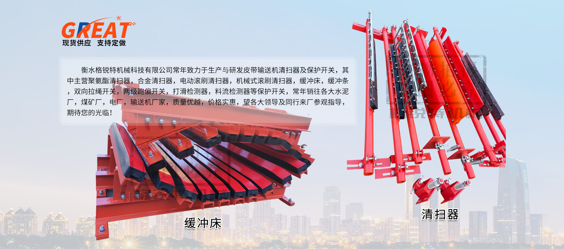 衡水格銳特機(jī)械科技有限公司常年致力于生產(chǎn)與研發(fā)皮帶輸送機(jī)清掃器及保護(hù)開關(guān),其中主營(yíng)聚氨酯清掃器,合金清掃器,電動(dòng)滾刷清掃器,機(jī)械式滾刷清掃器,緩沖床,緩沖條,雙向拉繩開關(guān),兩級(jí)跑偏開關(guān),打滑檢測(cè)器,料流檢測(cè)器等保護(hù)開關(guān),常年銷往各大水泥廠,煤礦廠,電廠,輸送機(jī)廠家,質(zhì)量?jī)?yōu)越,價(jià)格實(shí)惠,望各大領(lǐng)導(dǎo)及同行來廠參觀指導(dǎo),期待您的光臨!!!